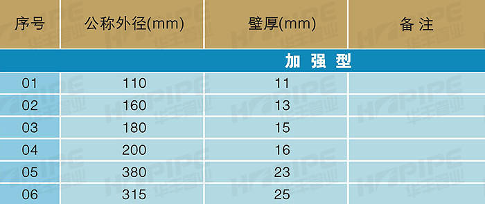 韧性好,具有优良的抗地层沉降及抗震性能。常用管材分为普通型和加强型。普通型适用于开挖铺设施工和非开挖穿越施工埋深小于4米的工程;加强型用于非开挖穿越施工埋深大于4米的工程。